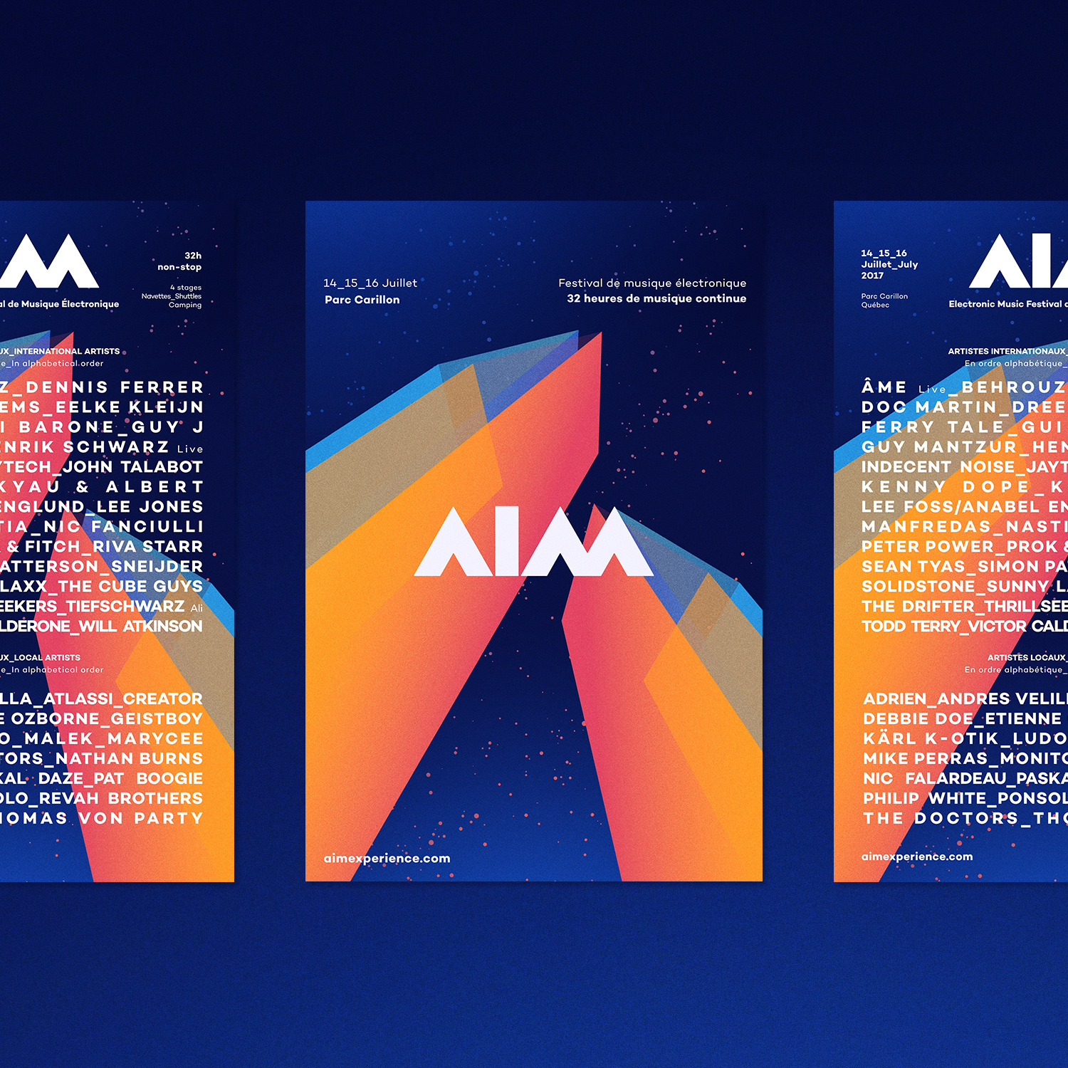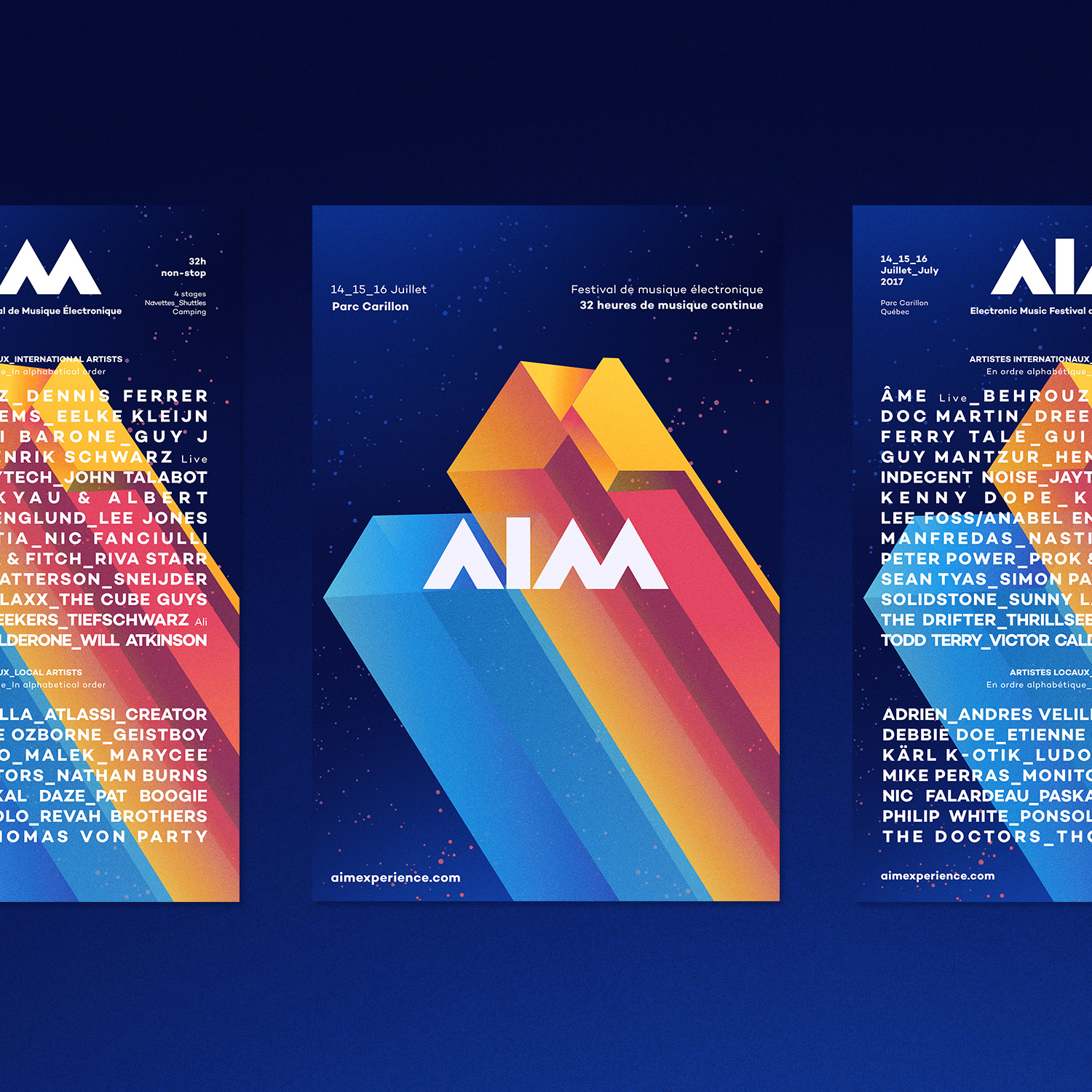 AIM (Art-Innovation-Mouvement) is an artistic organization with the mission of creating a unique platform bringing together electronic music and digital arts fans from all walks of life. To smoothly translate their mission into visual identity, AIM has commissioned Bzoing's services to design all visual material for the Festival's 2017 edition.