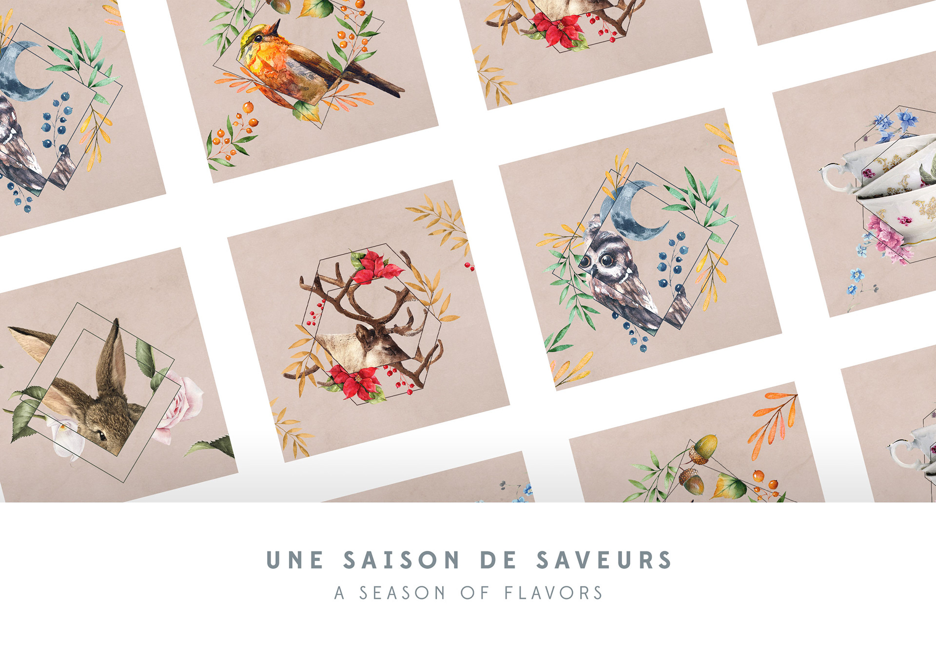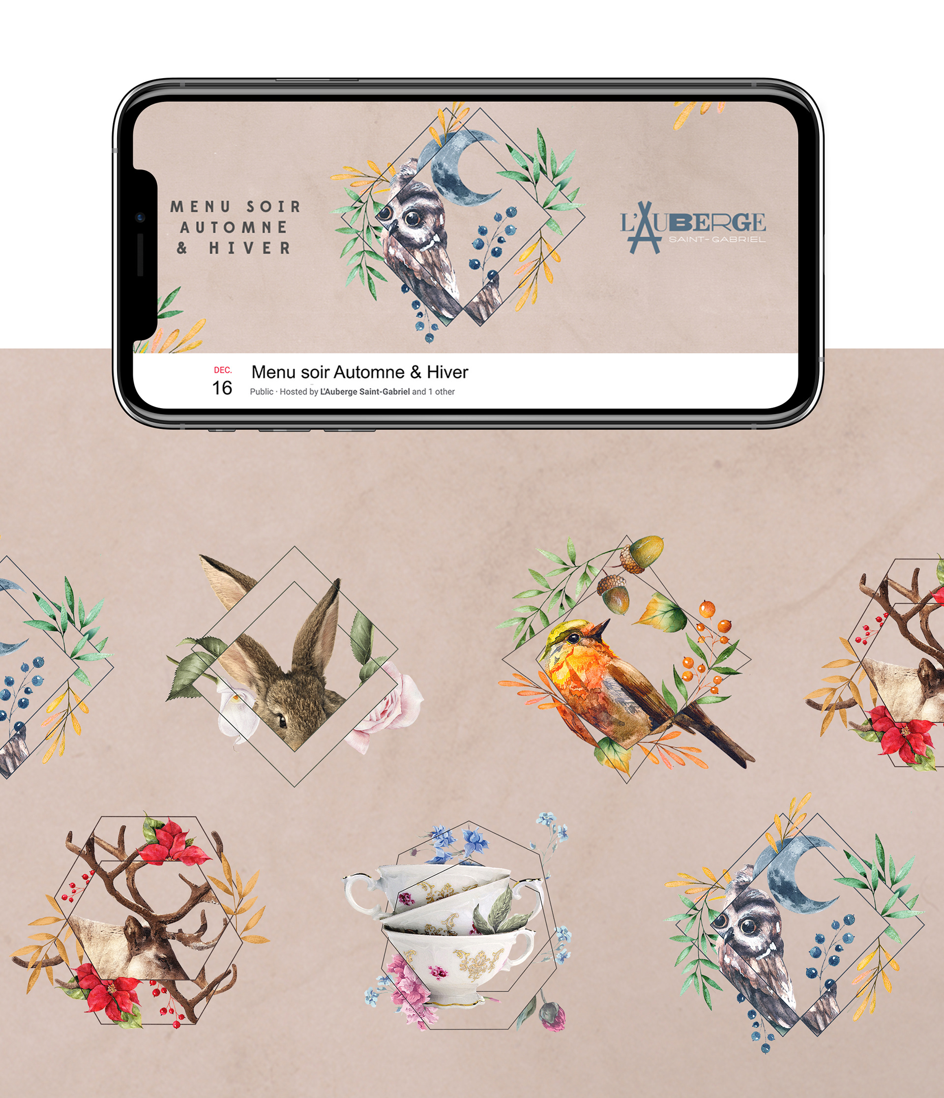 A graphic system was developed to promote their seasonal menus. For each menu a bespoke collage illustration was created drawing inspiration from nature.